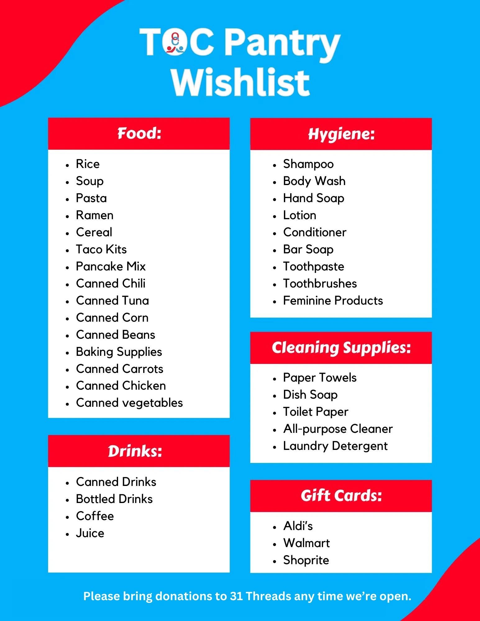 Donations accepted for the Giving Pantry at the 31 Threads entrance during any open hours.