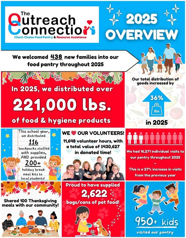 We have a wide variety of sponsorship opportunities available for companies of all sizes! Reach out to rachel@theoutreachconnection.org to schedule a meeting and tour our facility to learn the benefits of sponsoring our pantry!